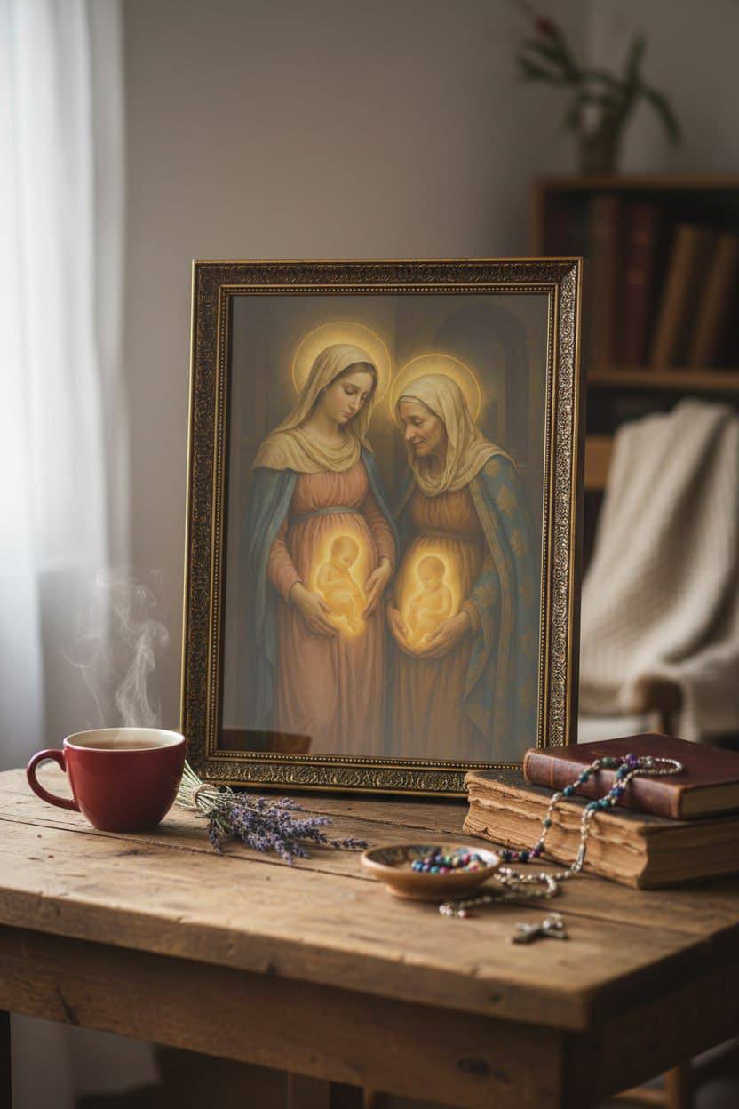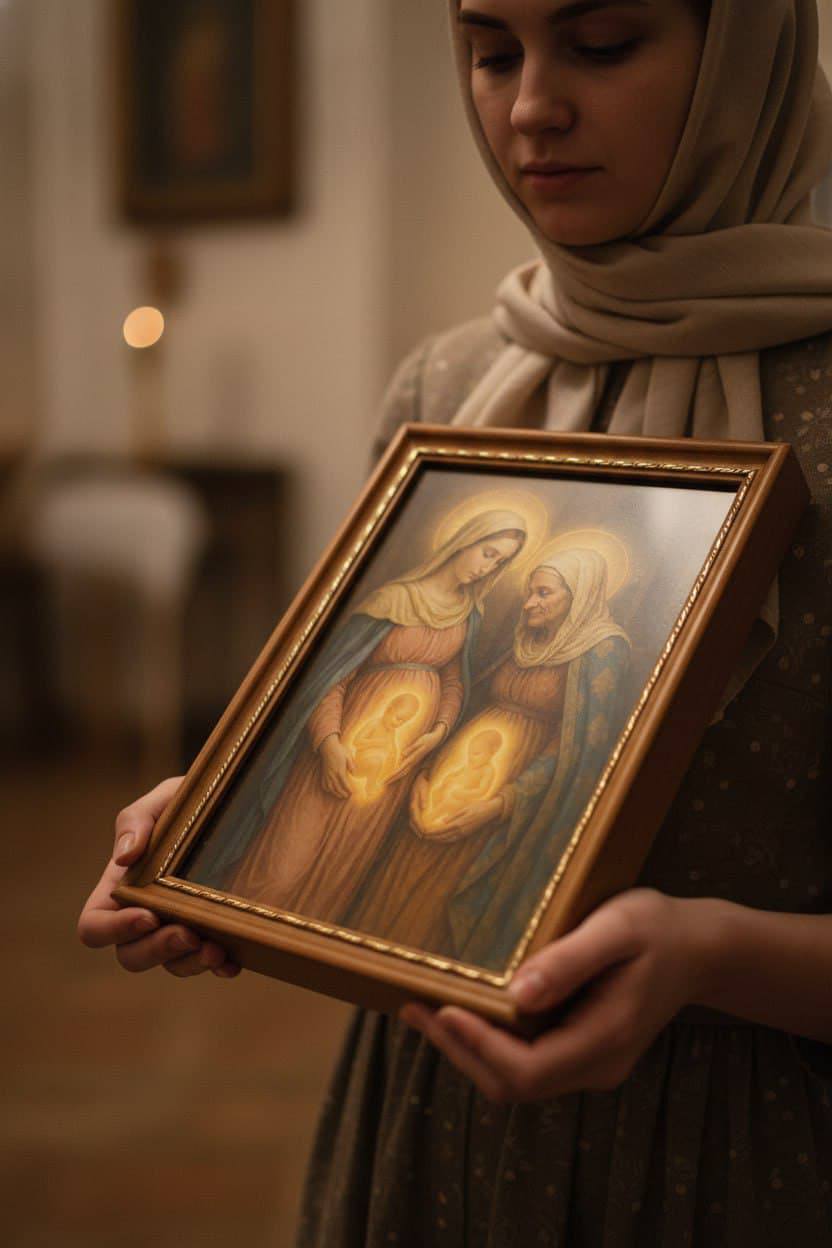 Светящиеся младенцы: изображения Иисуса и Иоанна выполнены в виде сияющих фигур в руках матерей. Золотой свет символизирует божественную благодать, чистоту и предначертанную миссию детей.