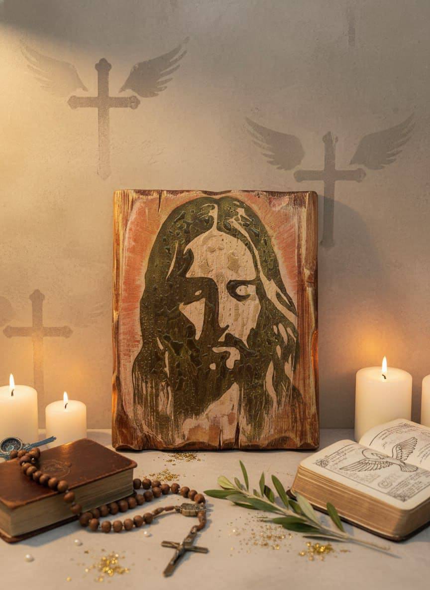 Образ лика Христа здесь не просто икона, а центр духовного сосредоточения — напоминание о присутствии Божием в жизни каждого человека. Такой образ идеально подходит для личного молитвенного уголка или созерцательного размышления о христианских истинах.