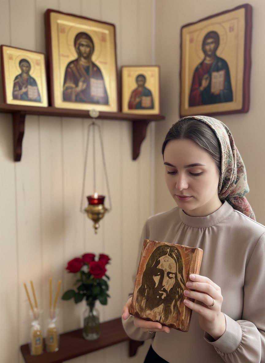 Натуральная деревянная основа с сохранённой текстурой дерева создаёт ощущение древности и связи с традициями иконописи.