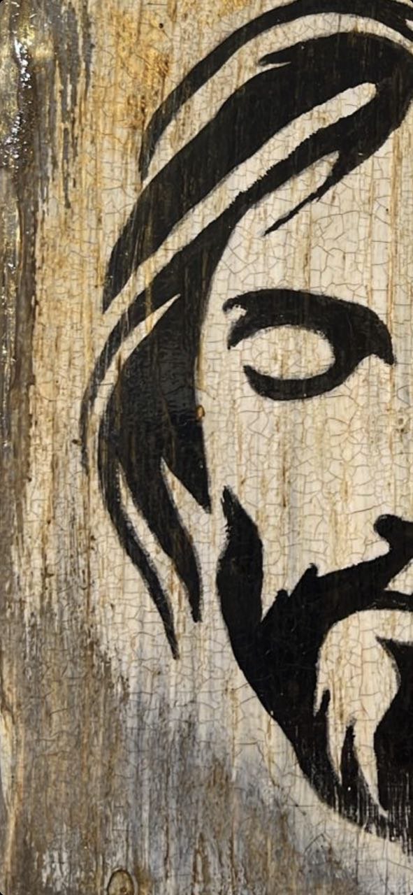 На изображении представлен художественный образ лика Иисуса Христа, выполненный в сдержанной, почти монохромной гамме на деревянной доске. Лик Спасителя выглядит глубоко символичным: мягкие, размытые контуры создают ощущение мистической прозрачности, словно образ проступает сквозь время и материю. Тёплые оттенки фона подчёркивают духовную глубину и умиротворённость композиции.