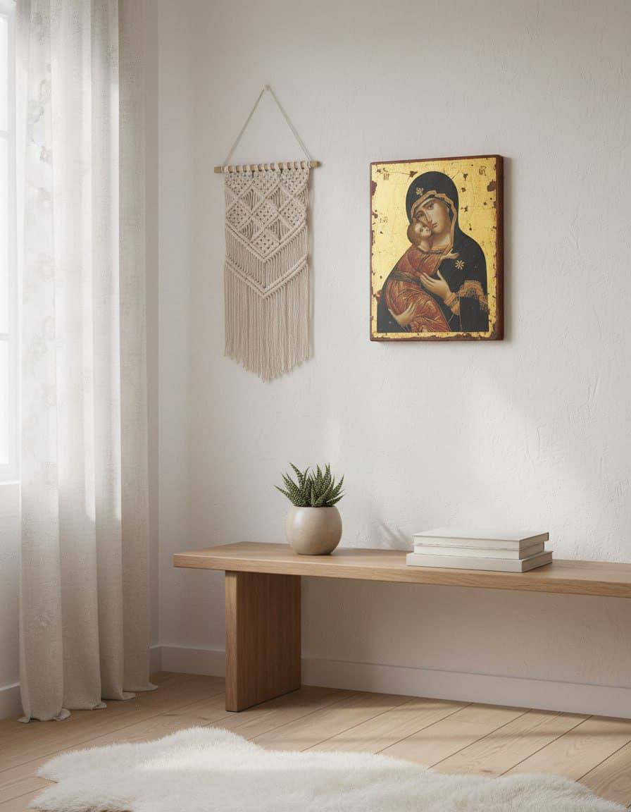 Стиль: сочетает элементы традиционного иконописного искусства и минимализма, что позволяет изделию органично вписаться как в религиозный, так и в современный интерьер.