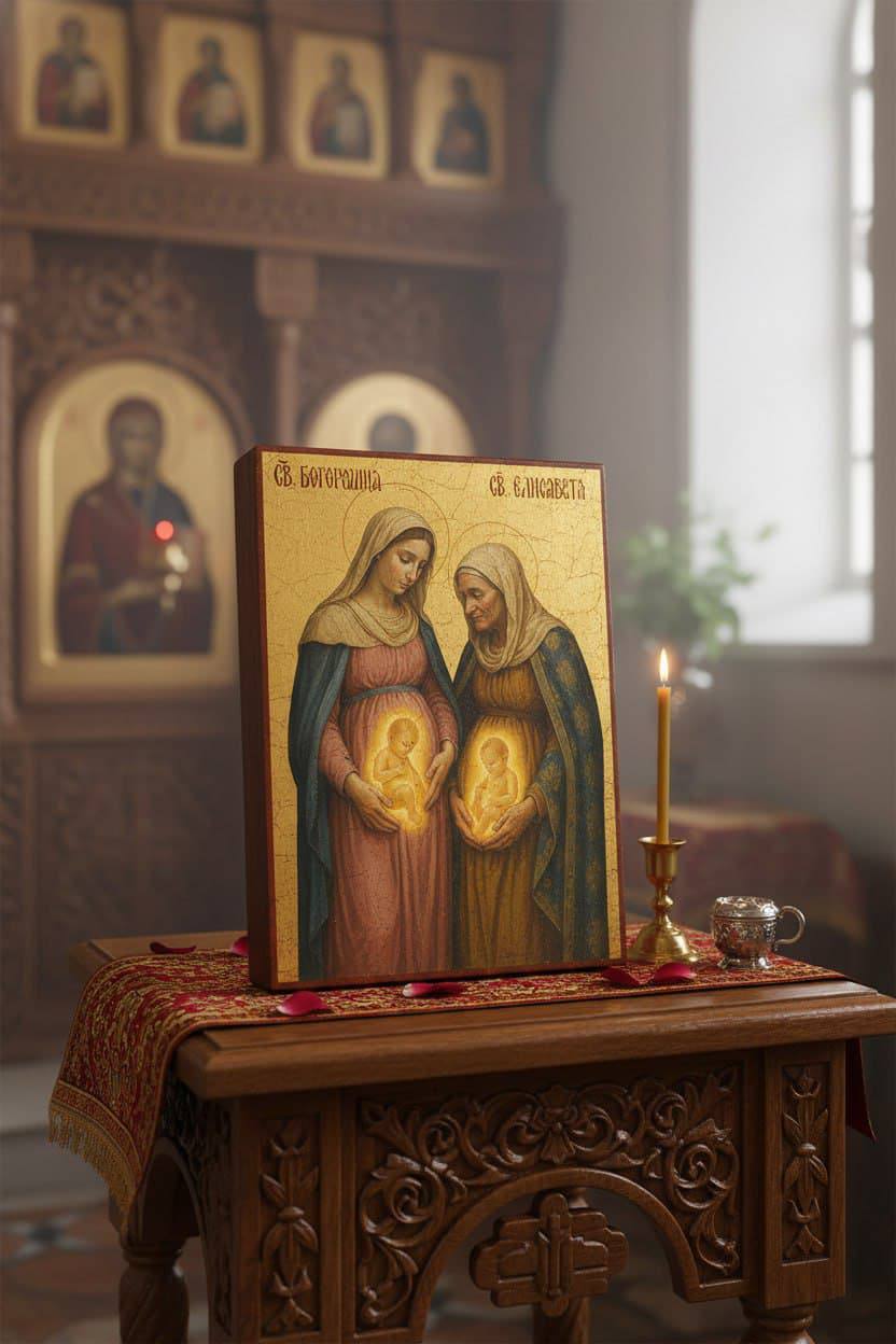 Контекст и значение: Эта икона воплощает важные христианские ценности: материнскую любовь, заботу, духовное родство и исполнение Божьей воли. Встреча Марии и Елисаветы — один из ключевых эпизодов Евангелия, символизирующий радость благой вести и единство в вере. Духовное назначение: Икона предназначена для молитвы о семейном благополучии, защите детей, укреплении веры и обретении духовной поддержки. Она напоминает о важности материнства, милосердия и доверия Божьему промыслу.