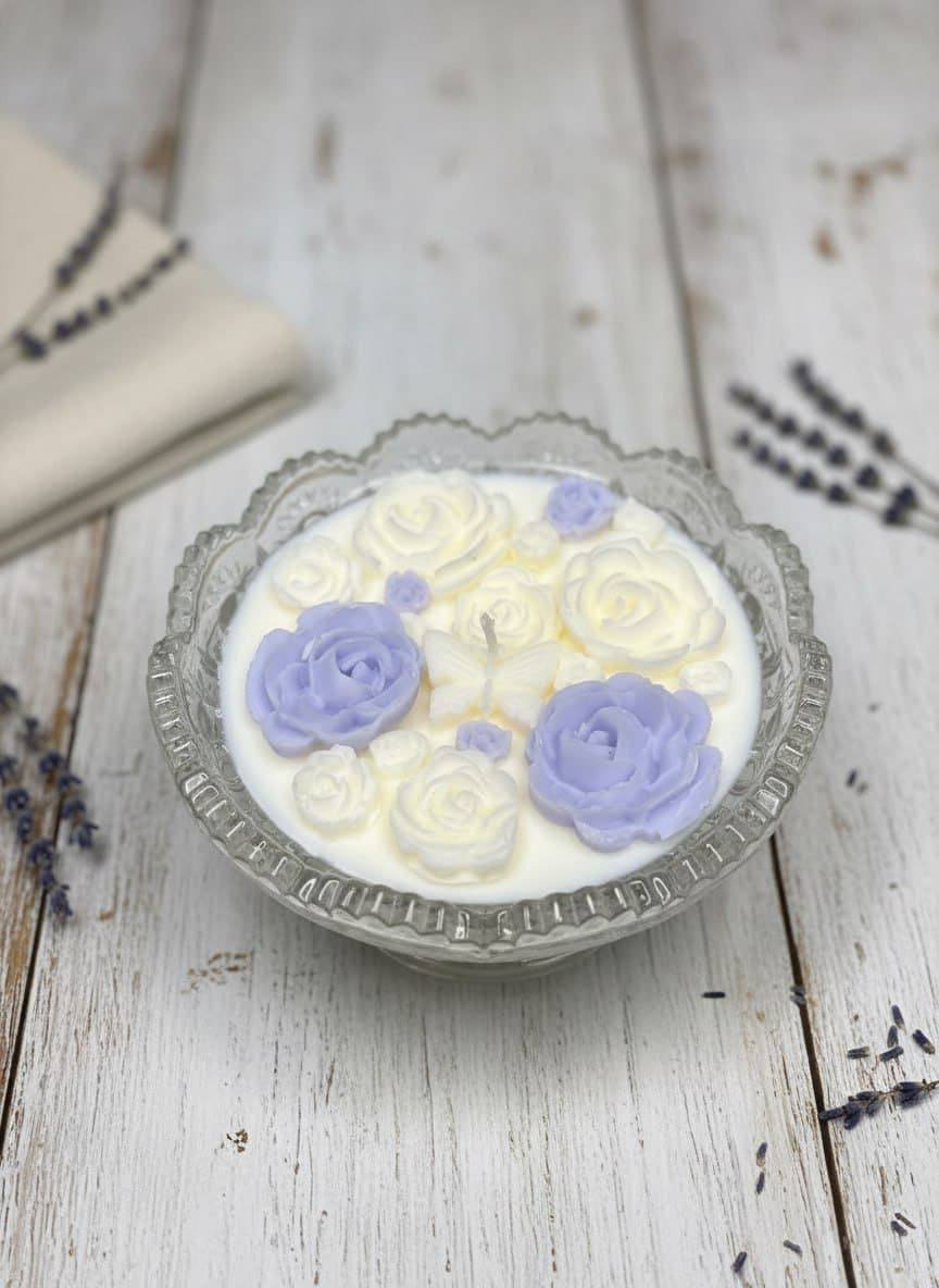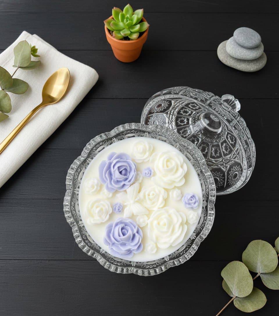 Дизайн: сочетание прозрачного воска и объёмных роз создаёт эффект глубины и многослойности.