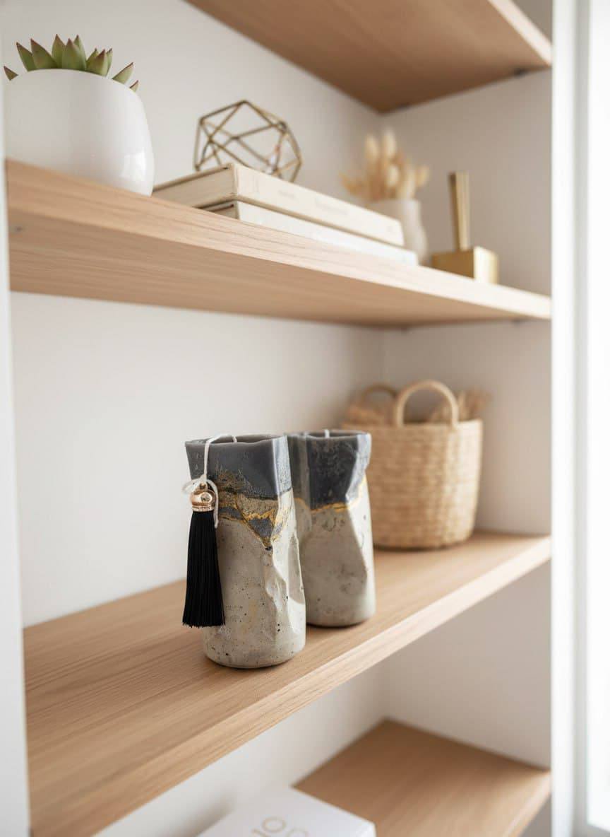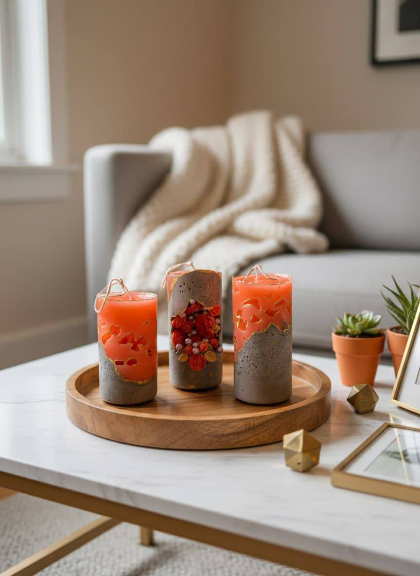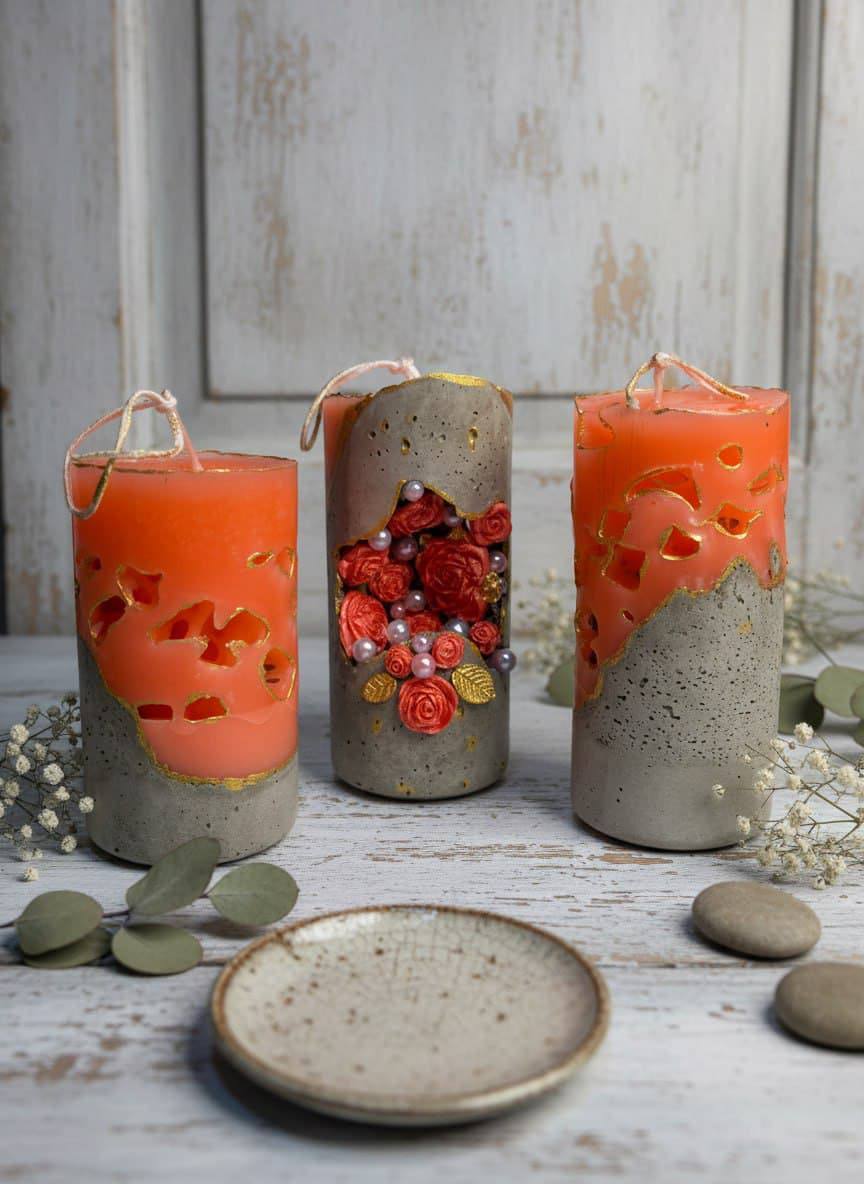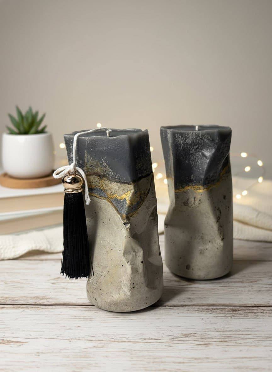 Текстура: сочетание шероховатой бетонной основы и гладкого, слегка полупрозрачного парафина создаёт интересный тактильный и визуальный эффект.
