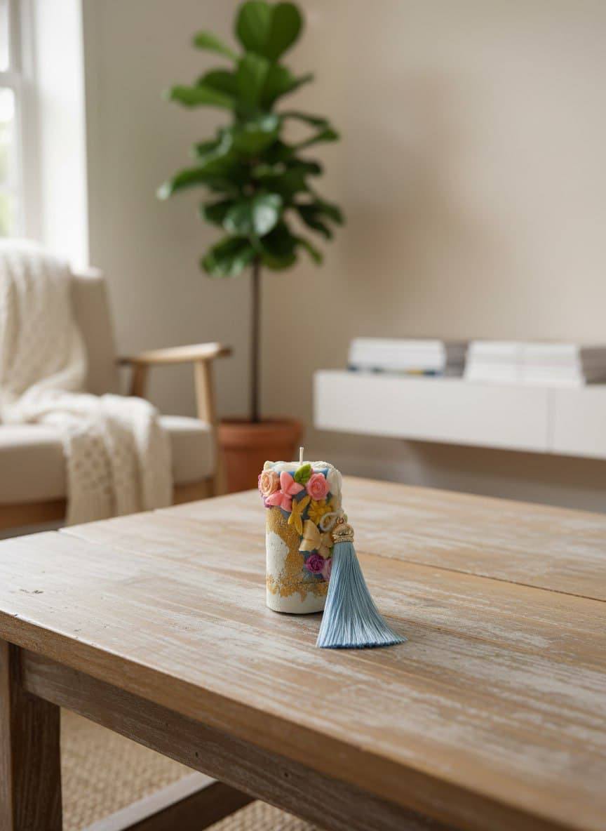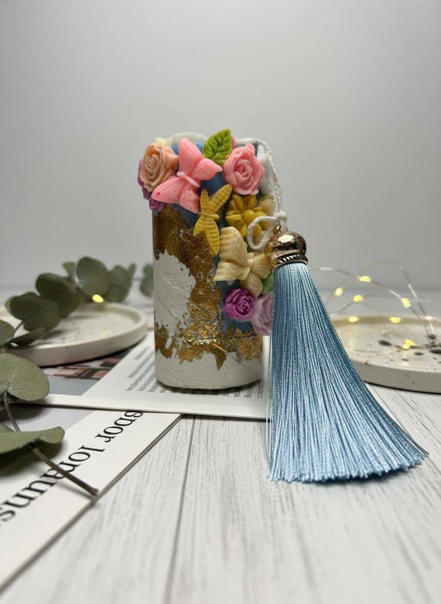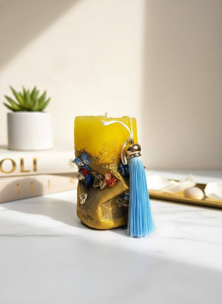 Финальный акцент: изящная кисточка небесно-голубого цвета с золотистым наконечником. Она не только украшает свечу, но и добавляет динамики в композицию.