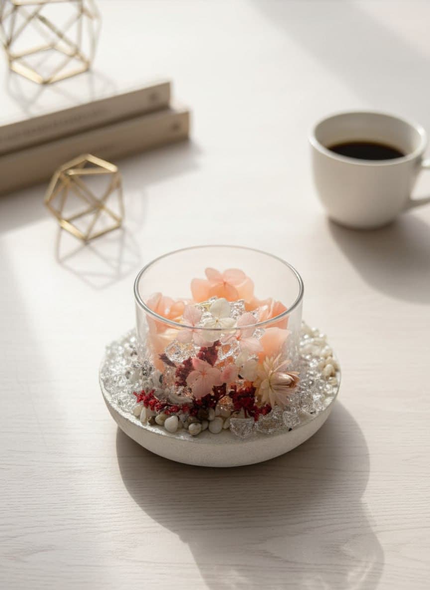 Декор: основание свечи украшено композицией из стабилизированных цветов и прозрачных кристаллов, добавляющих изделию изысканности и глубины.