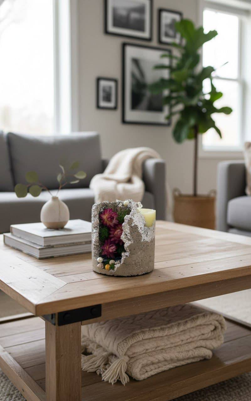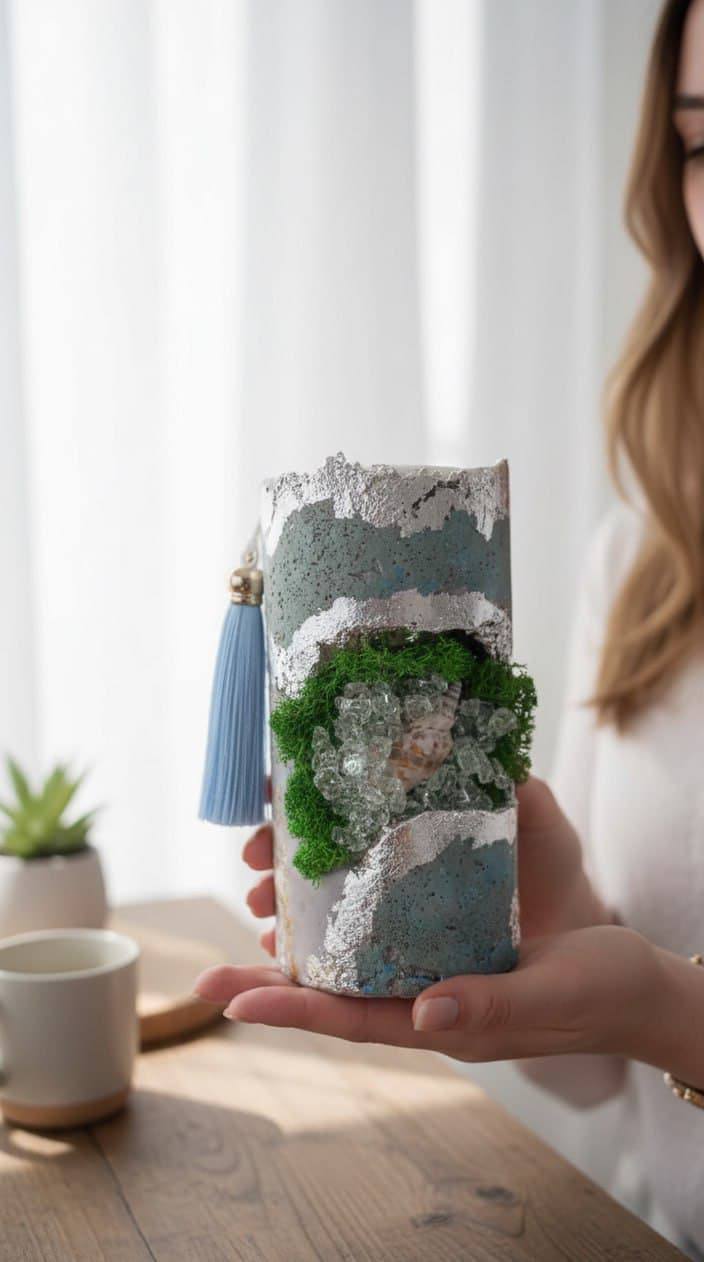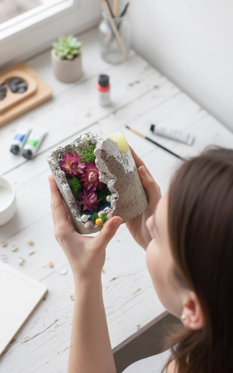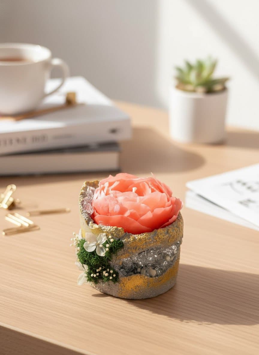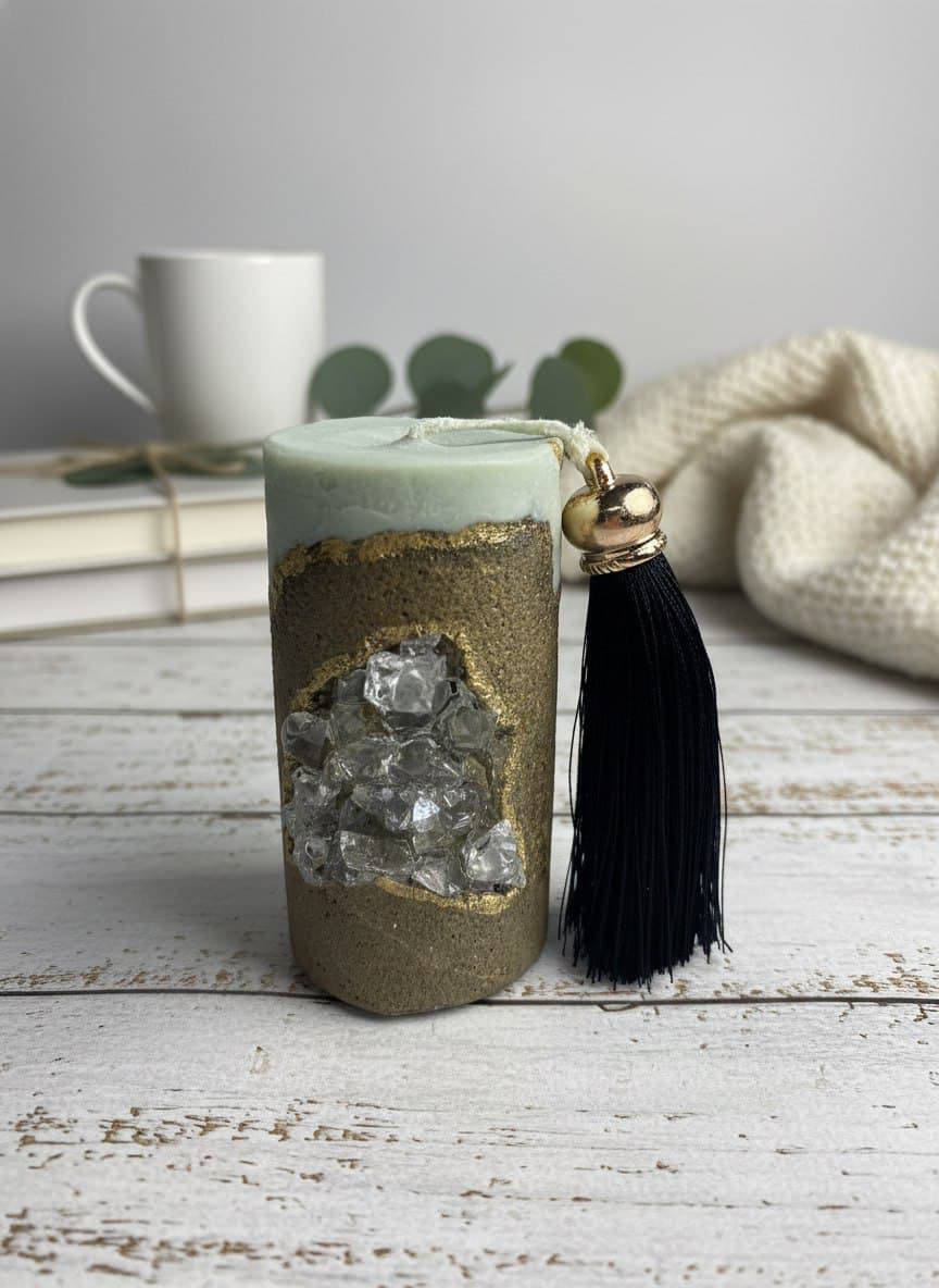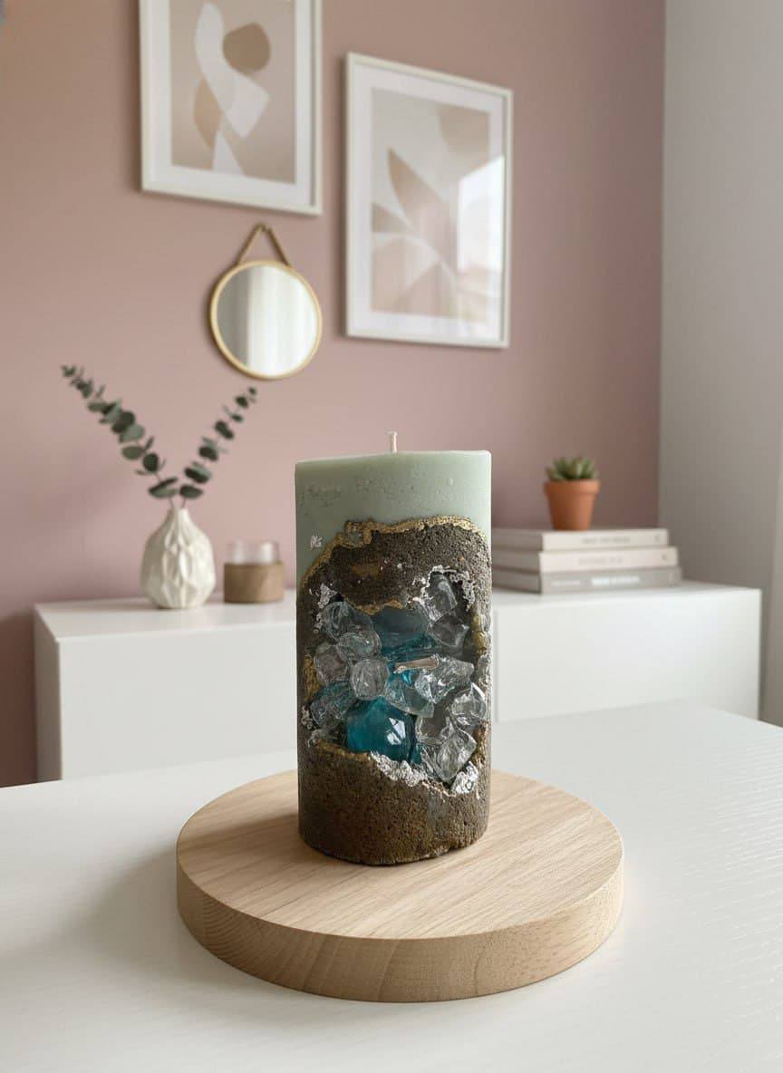 Дизайн: свеча оформлена в виде «геологической находки» — бетонное обрамление имитирует срез горной породы, а вкрапления камней и кристаллов создают эффект природных сокровищ.