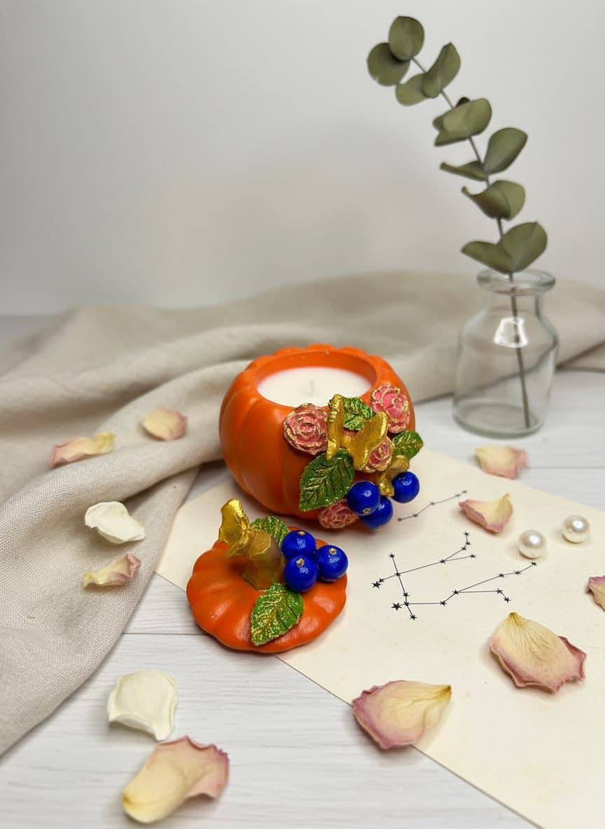 Эта очаровательная свеча ручной работы — настоящий шедевр осеннего декора! Выполненная в форме тыквы, она сочетает в себе теплоту натурального соевого воска и изысканный художественный декор. Особенности: