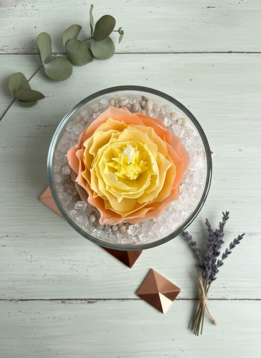 Погрузитесь в атмосферу утончённой красоты и гармонии с нашей эксклюзивной свечой из натурального пчелиного воска. Центральным элементом композиции стала изящная роза, искусно вылепленная вручную — её нежные лепестки переливаются оттенками персика и жёлтого, создавая ощущение живого цветка. Эта свеча — не просто источник света, а настоящий арт-объект для вашего интерьера: