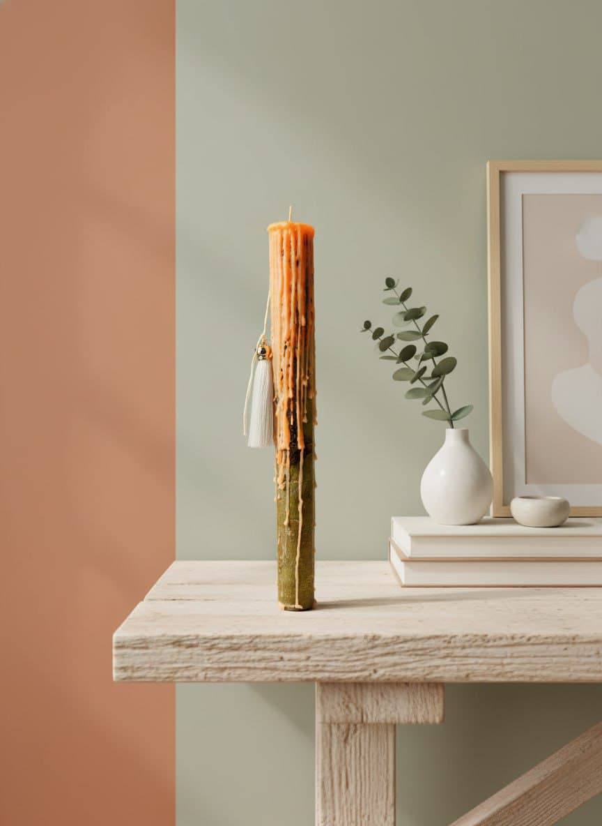 Текстура: поверхность свечи имеет лёгкую шероховатость, подчёркивающую ручную работу и уникальность каждого экземпляра.