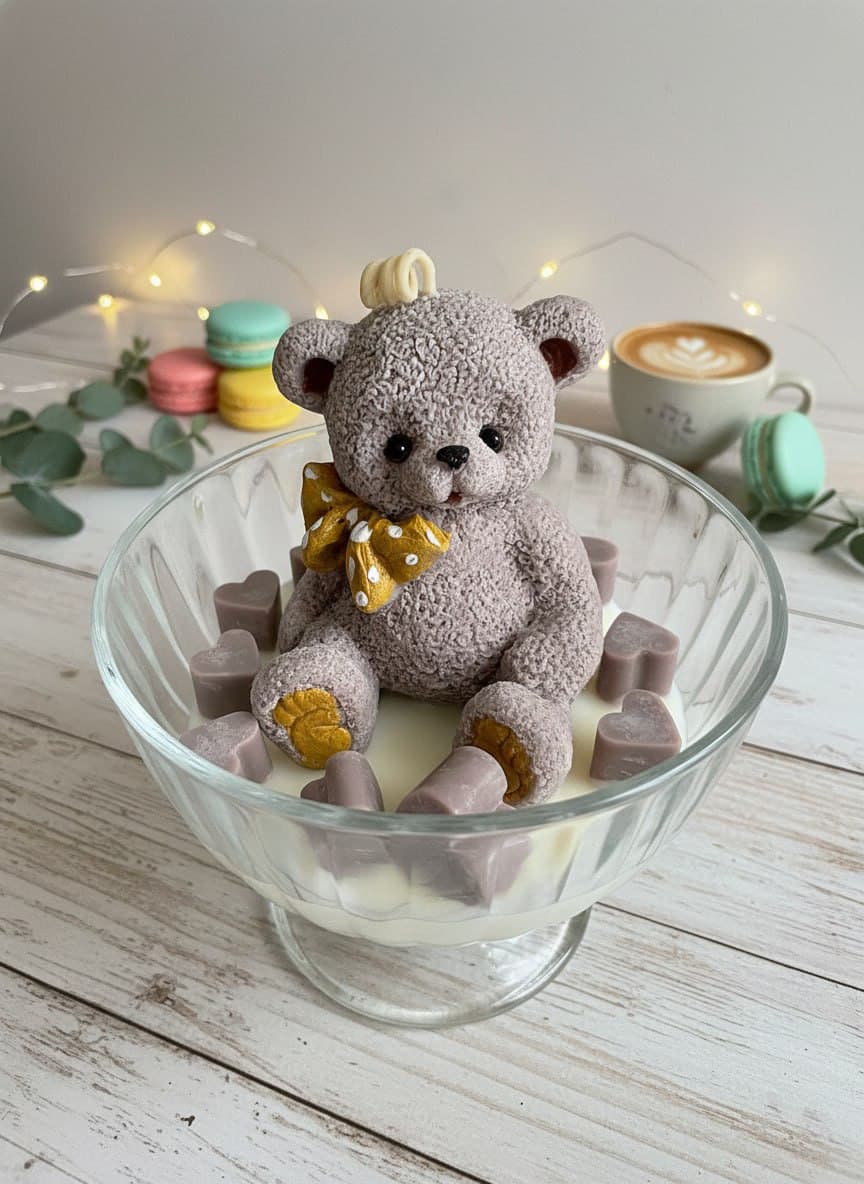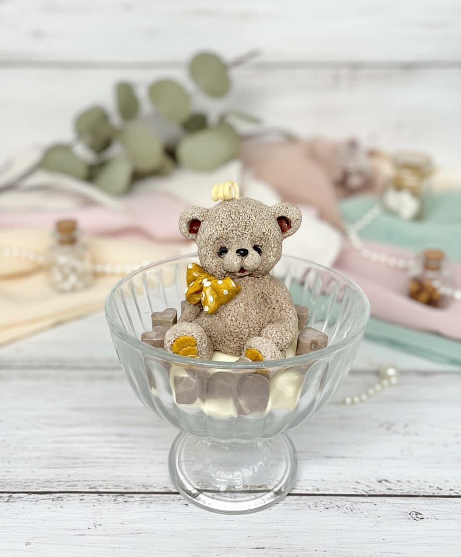 Эта очаровательная свеча ручной работы — воплощение уюта и нежности. Центральным элементом композиции стал милый медвежонок, словно уютно устроившийся в изящной стеклянной чаше. Текстурированная поверхность фигурки имитирует мягкий плюш, а детали — золотистый бантик в горошек и забавный завиток на голове — придают изделию особый шарм. Особенности свечи: