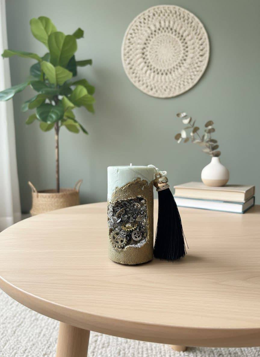 Финальный акцент: элегантная чёрная кисточка с металлическим наконечником, закреплённая на белой нити. Кисточка не только украшает свечу, но и добавляет динамики в композицию.