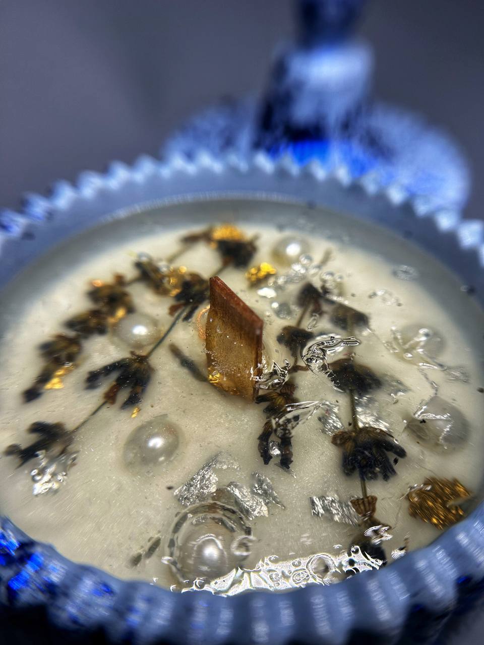 Погрузитесь в атмосферу утончённой роскоши с нашей свечой из гелевого воска. Изящное сочетание сухоцветов, мерцающих жемчужин и золотых акцентов создаёт неповторимый декоративный эффект. Прозрачная структура воска позволяет рассмотреть каждую деталь композиции — словно миниатюрный мир застыл во времени. Идеальный акцент для стильного интерьера, который добавит нотку изысканности и уюта в ваш дом.
