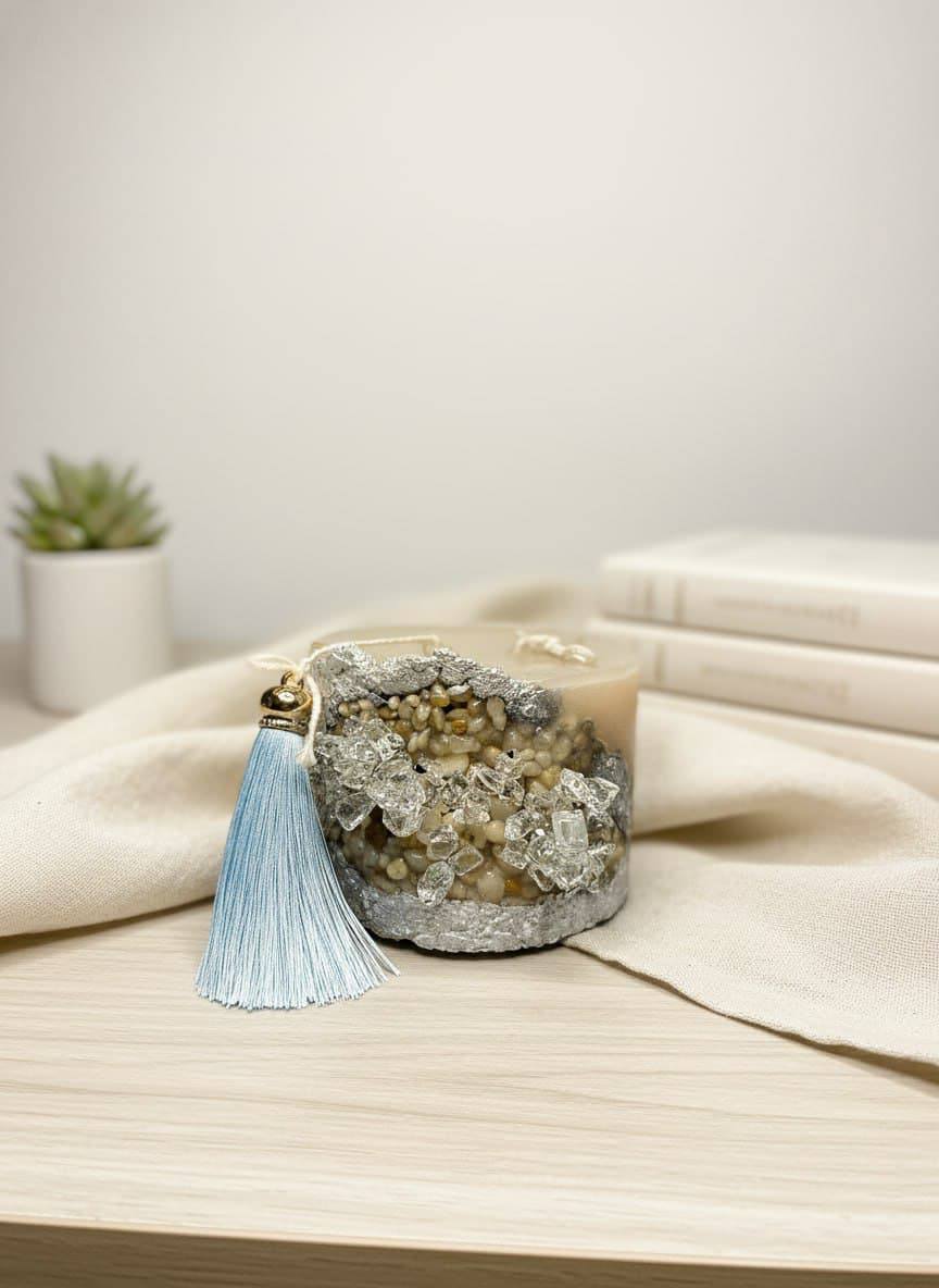 Ручная работа: каждая свеча уникальна — расположение камней и кристаллов может незначительно отличаться, что делает изделие эксклюзивным.