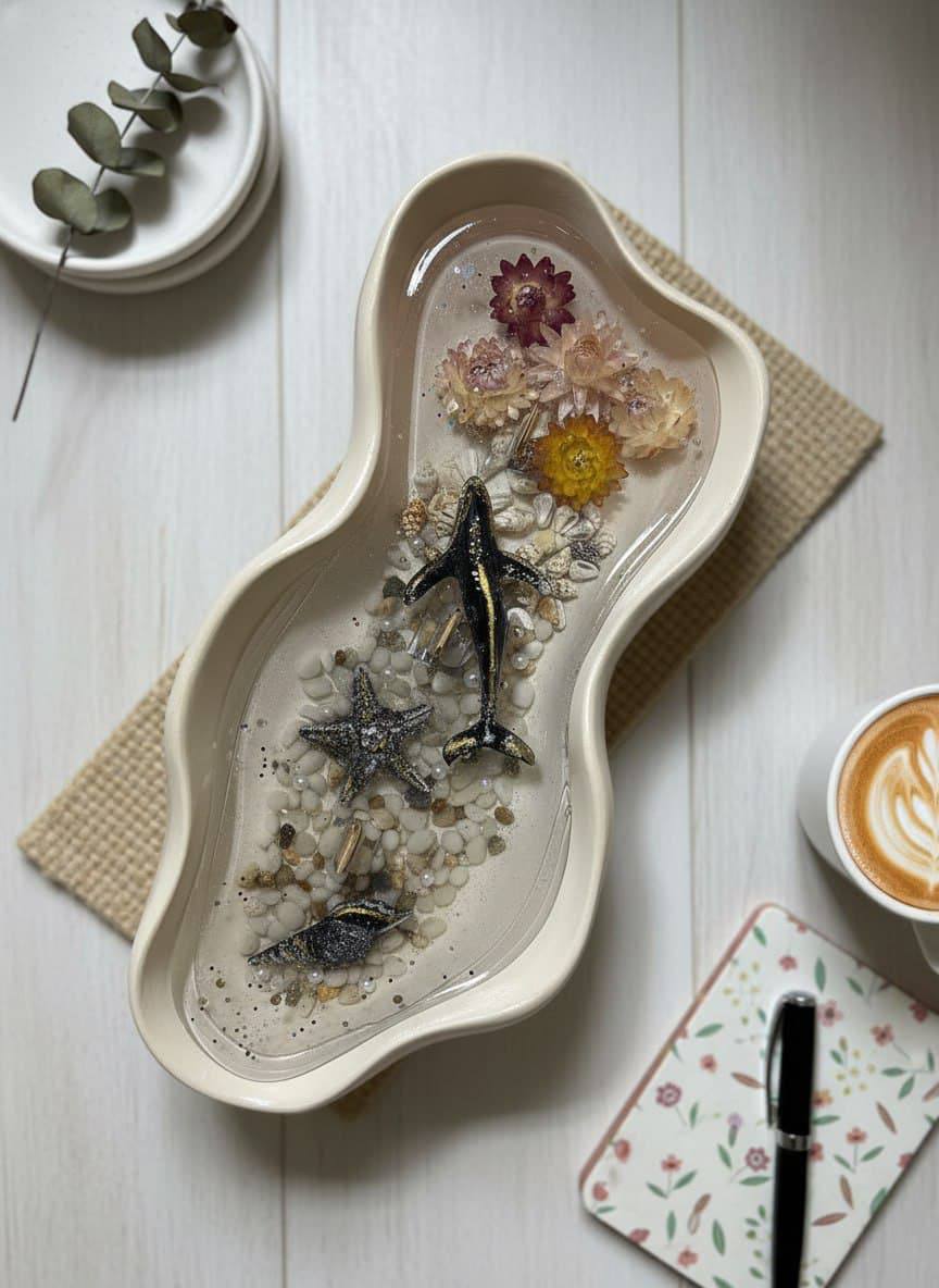 Дизайн: вытянутая форма с волнистыми краями напоминает морскую волну. Внутри композиции искусно размещены декоративные элементы: фигурки рыб и морских звёзд, миниатюрные камешки и ракушки, а также засушенные цветы нежных оттенков.