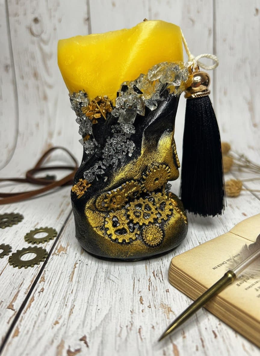 Эта уникальная свеча ручной работы — настоящее произведение искусства, сочетающее в себе элементы стимпанка и роскоши. Изделие изготовлено из высококачественного парафина, который обеспечивает чистое горение и мягкий, уютный свет. Особенности: