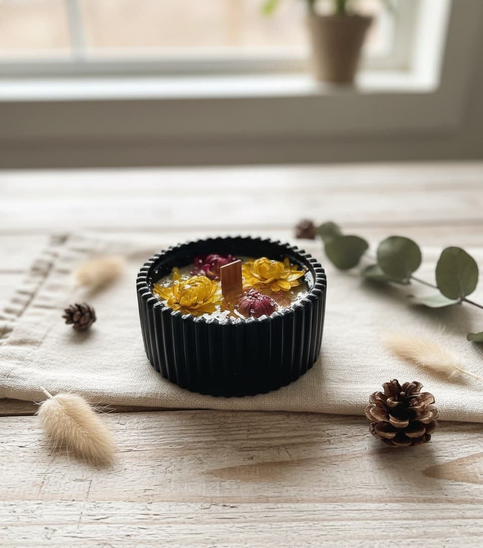 Дополнительные детали: нежные сухоцветы и зелень у основания свечи добавляют композиции утончённости и природной гармонии.