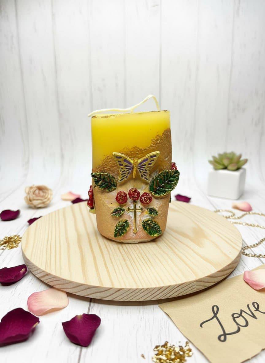Дизайн: цилиндрическая форма с художественным нанесением золотой краски, создающей эффект роскошной россыпи. Верхняя часть украшена объёмными элементами из парафина: нежными розами пастельных оттенков, яркими бабочками и изящными листьями.