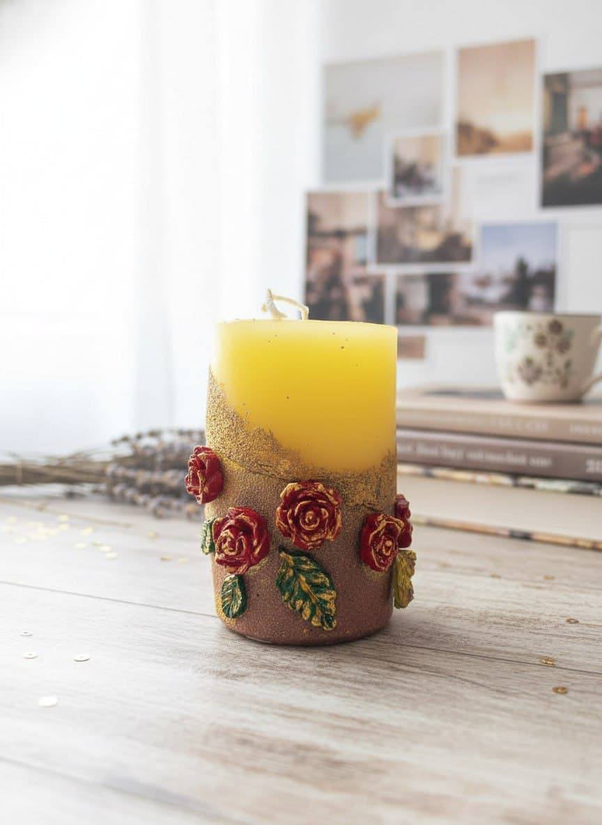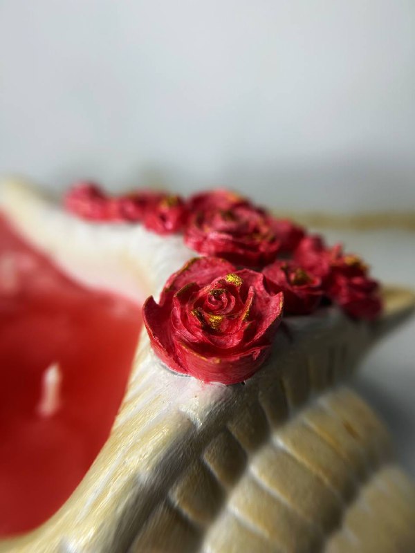 Декор: ручка свечи декорирована объёмными розами насыщенного розового оттенка, дополненными золотыми листьями. Этот элемент создаёт ощущение роскоши и романтичности.