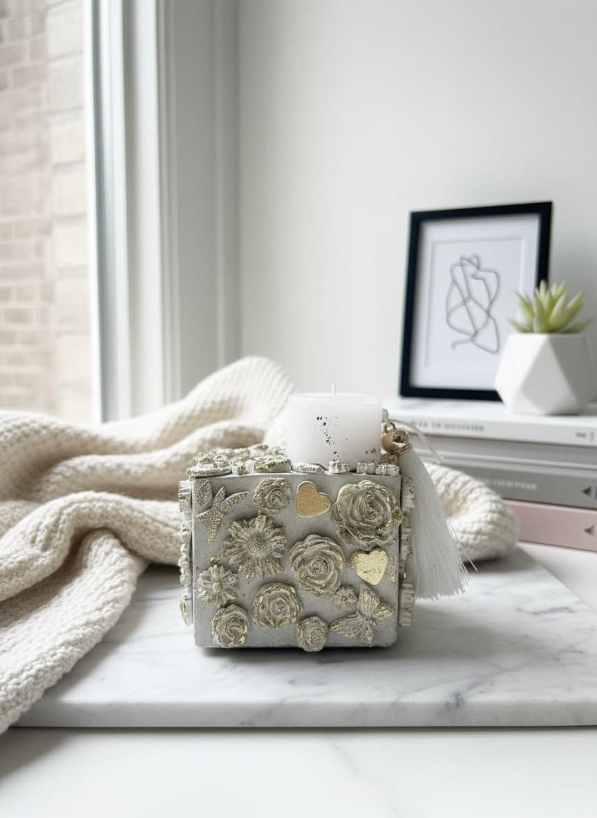 Бетонный подсвечник ручной работы — выполнен в форме куба с изысканным декором: рельефные цветы и сердечки, украшенные золотой поталью, создают ощущение дворцовой роскоши.