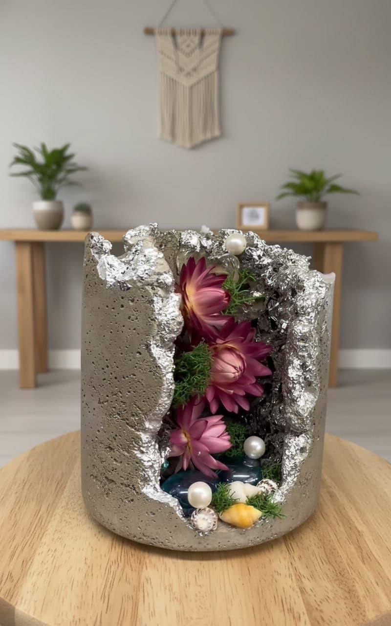 Эта уникальная свеча ручной работы — настоящее произведение искусства, сочетающее в себе урбанистическую эстетику бетона и природную нежность цветов. Основа изделия выполнена из высококачественного бетона с эффектной текстурой, покрытого серебристой поталью, которая создаёт иллюзию мерцающего металлического обрамления, напоминающего стены таинственной пещеры. Главная изюминка — изысканная композиция внутри «грота»: